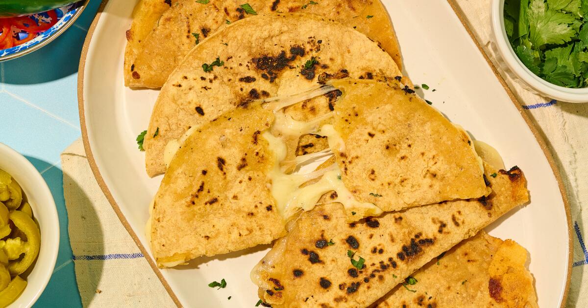 These quesadillas are made with corn tortillas, folded in half, which is how they’re traditionally made in most parts of Mexico. They’re like slim, cheesy hand pies. They’re easy to make and a perfect accompaniment to a big pot of chili to feed a crowd. A cast-iron skillet or carbon steel comal is ideal for getting some of the flavorful char on the tortillas.